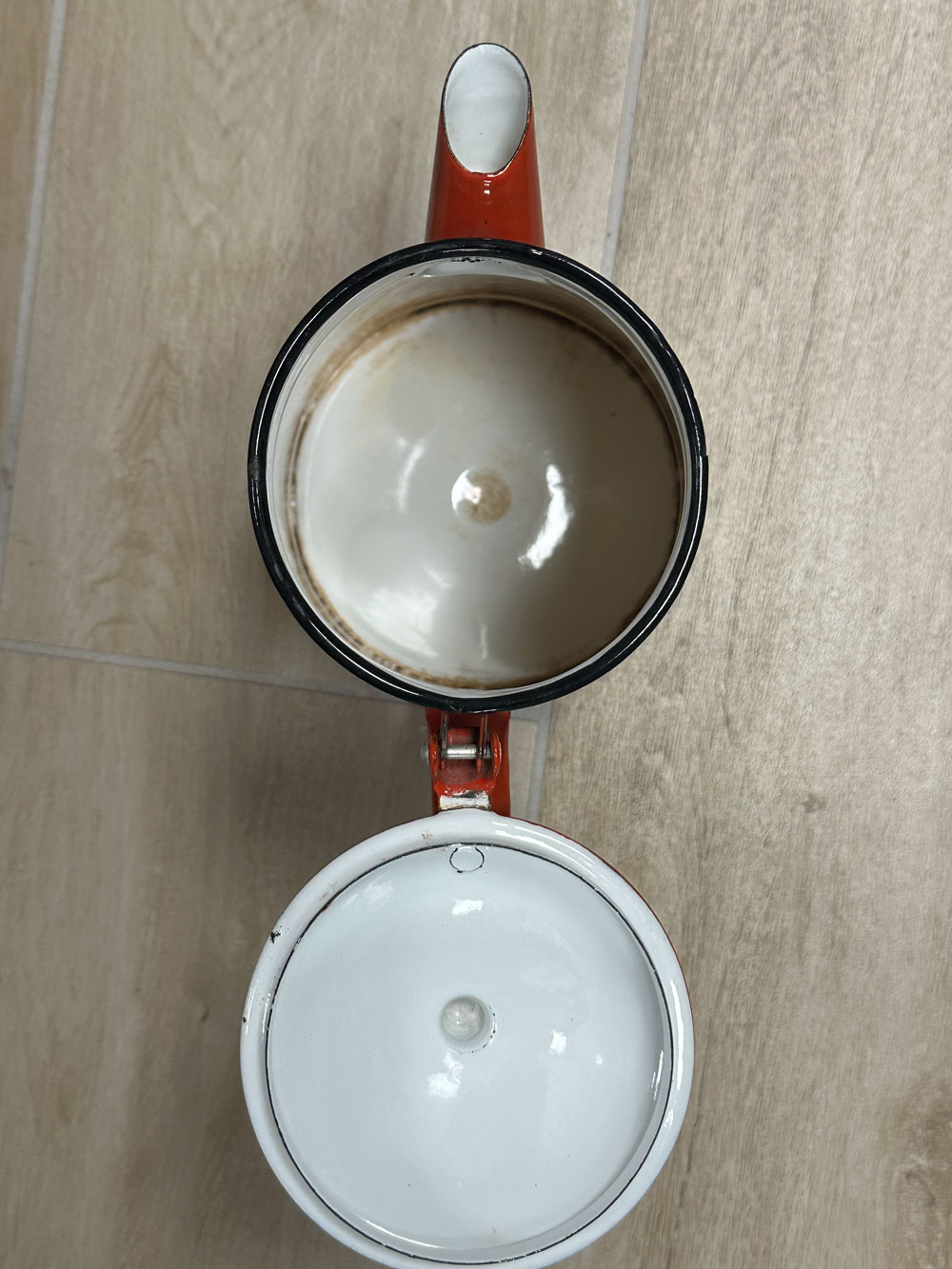 Cafetière vintage rouge émaillée Japy, en bon état vu son âge !