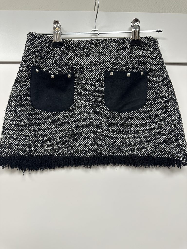 Jupe noire et blanche doublée, poches cloutées sur le devant, fermeture éclair à l’arrière et franges dans le bas.